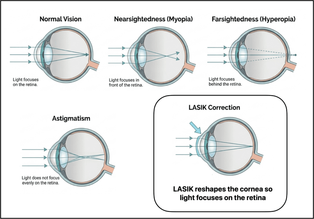 To understand LASIK, it helps to start with the cornea, the clear front surface of the eye. The cornea does a large part of the eye’s focusing. In refractive errors such as myopia, hyperopia, and astigmatism, light is not being focused on the retina as precisely as it should be.